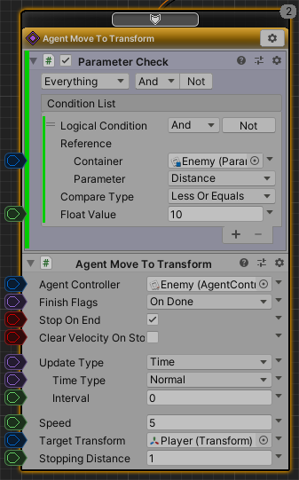 Again by making the Distance parameter greater than 10 you can see that the Agent Move To Transform node is interrupted and the Agent Move On Waypoint node becomes active.