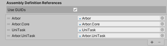 If necessary, add a reference to “Packages/Arbor 3: FSM & BT Graph Editor/External/UniTask/Arbor.UniTask.asmdef” to the list of Assembly Definition References.