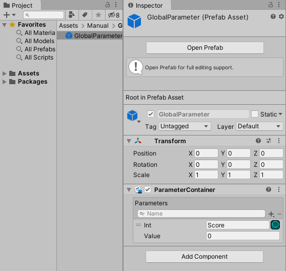 • GlobalParameterContainerが追加されている状態のGameObjectが作成される